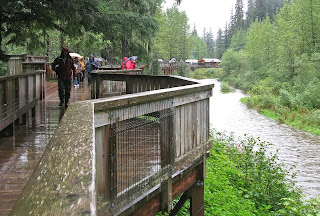 We continued to the junction of the Cassier and Yellowhead (16) and headed towards Prince Rupert. We stopped in Terrace for the night at the Ferry Island Municipal Campground. Its a wonderful campground with a nice walking loop along the Skeena River in the rain forest. There are about 53 whimsical tree carvings along the loop. It was kind of like a treasure hunt looking for and finding the carvings.